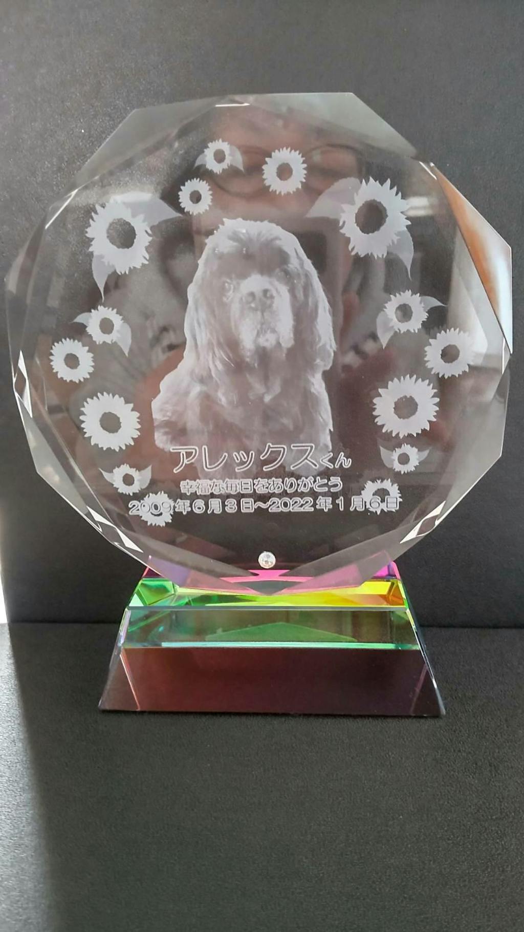 | 備考 | ・価格に含まれるもの (商品代金・校正代金3回・彫刻代金) (ロゴマークなど別途データを作成する必要がある場合には別途費用がかかる場合がございます。) ・複数種類のお写真でイメージ画像を複数希望される場合は、追加のお写真1枚ごとに別途2,200円かかります。 ・耳や足が切れており、修復や他の写真と合成が必要な場合は別途加工費が1箇所につき3,300円かかります。(ただし、対応できないケースもあります。事前にお問い合わせください。) ・イメージ画像作成後、別のお写真でイメージ画像の作成を希望される場合は追加のお写真1枚ごとに別途2,200円かかります。 ・2匹での作成も可能ですが、別途2,200円かかります。 ・ガラス・クリスタル製品は材料の特質上、内部に小さな気泡や不純物が見られる場合がございます。 また、素材その物の成型時に、研磨あと、筋、気泡による穴、カケなどが発生いたします。 透明度の高い美しいクリスタルを作るために致し方ないものとしてご了承いただきますようお願い申し上げます。 |